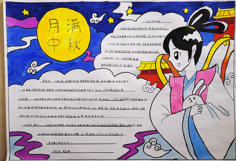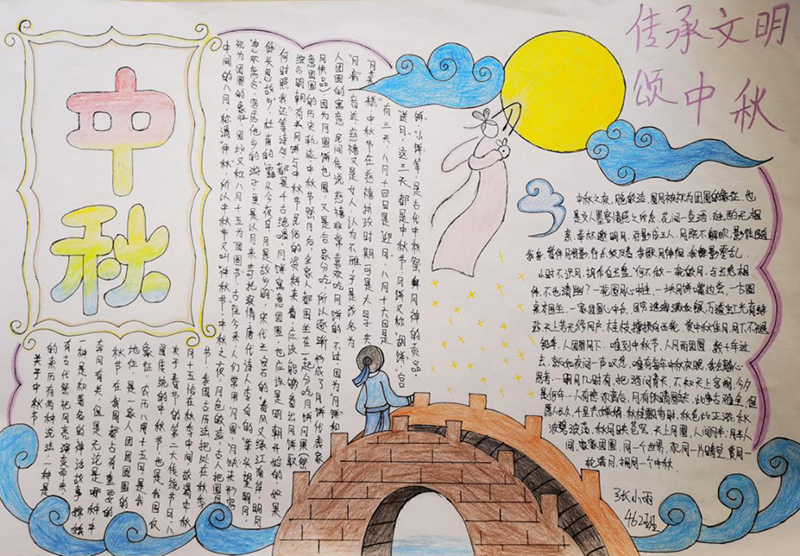 1、開展以“傳承文明頌中秋”為主題的手抄報評比活動。引導(dǎo)同學(xué)們在手抄報中了解中華悠久歷史、優(yōu)良傳統(tǒng)和節(jié)日民俗,繼承傳統(tǒng)美德。
