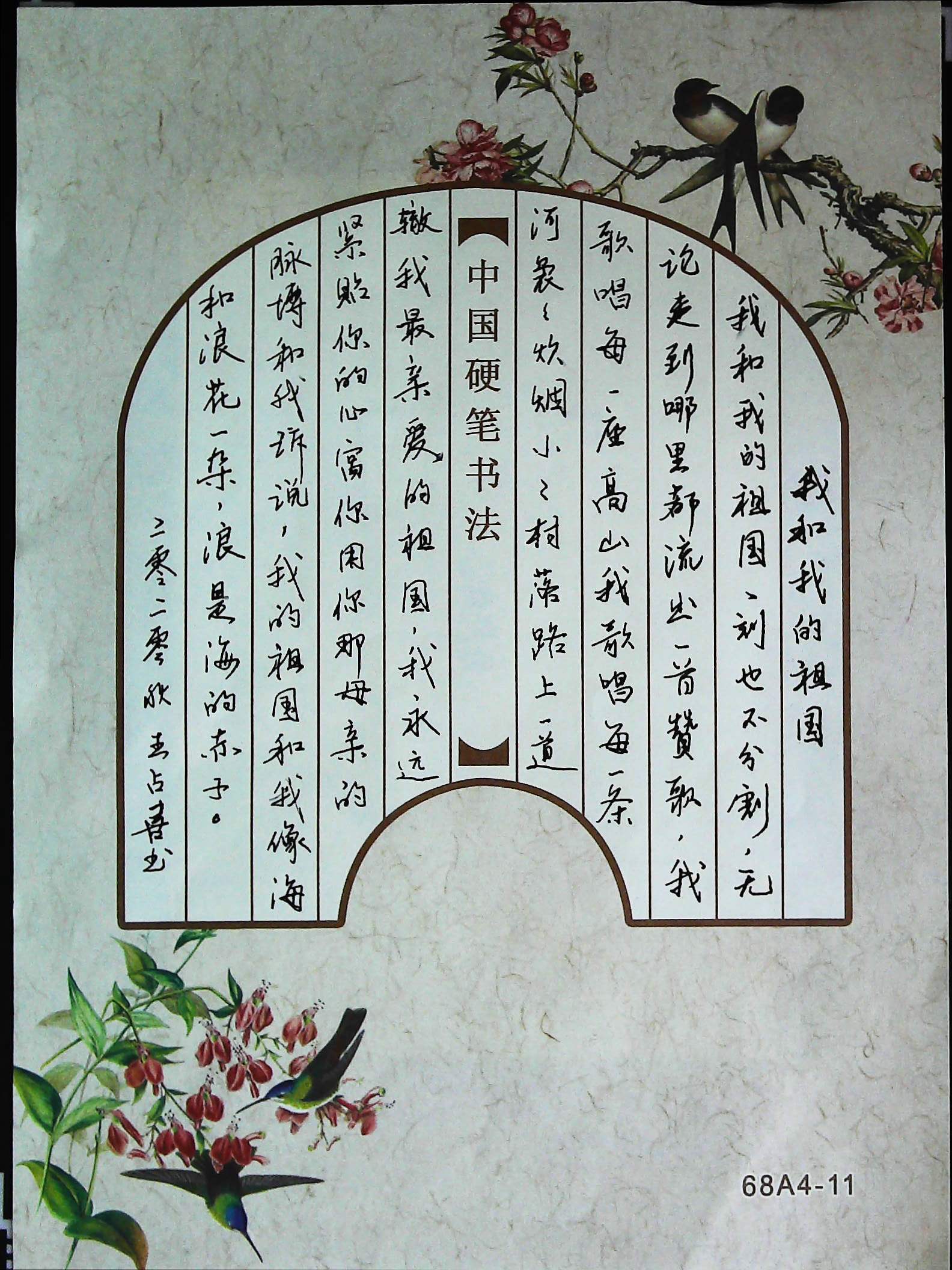 為豐富校園文化生活,抒發(fā)愛國主義情懷,作為學(xué)校開展的“唱時(shí)代金曲 抒愛國情懷”系列活動之一,近日校黨總支和校工會共同舉辦了“愛國歌詞 書寫祖國”硬筆書法作品征集活動。